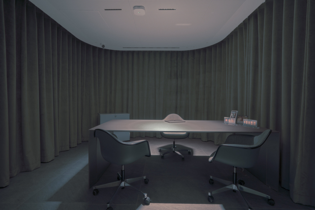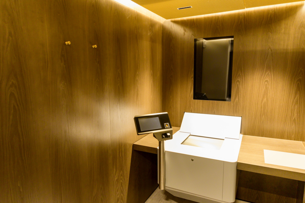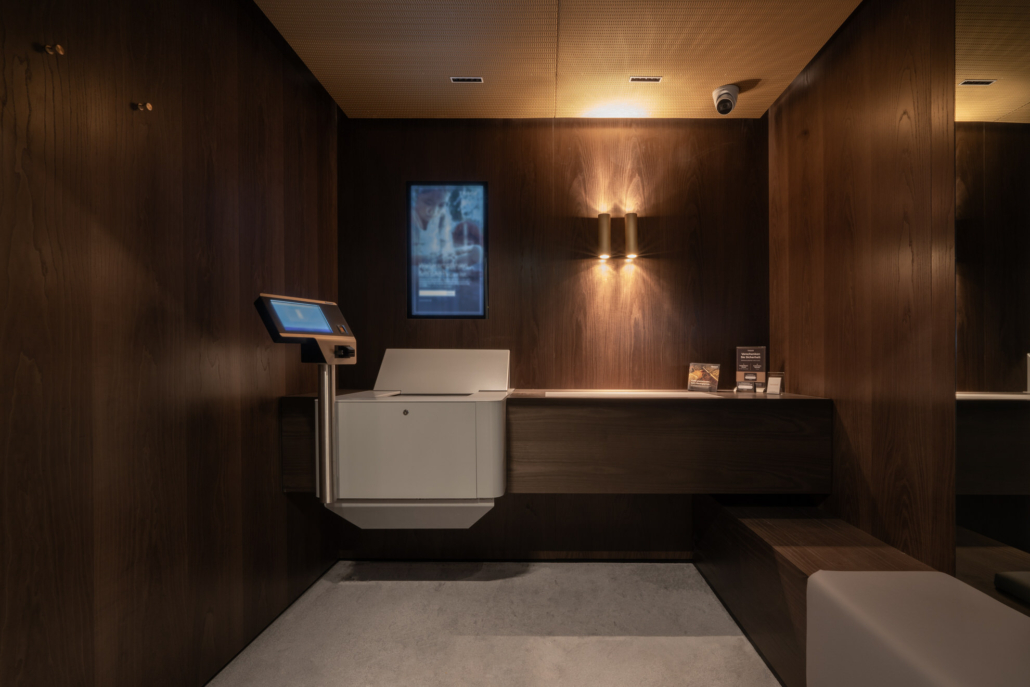 Ein besonderes Augenmerk lag auf den Kundenkabinen mit integrierter Zutrittskontrolle. Die individuell entwickelten, bündigen Sondertüren fügen sich nahtlos in die Wandflächen ein und verbinden höchste Sicherheitsanforderungen mit einem ruhigen, architektonisch klaren Erscheinungsbild. Dieses Prinzip setzt sich bei den flächenbündigen Zimmertüren konsequent fort.
