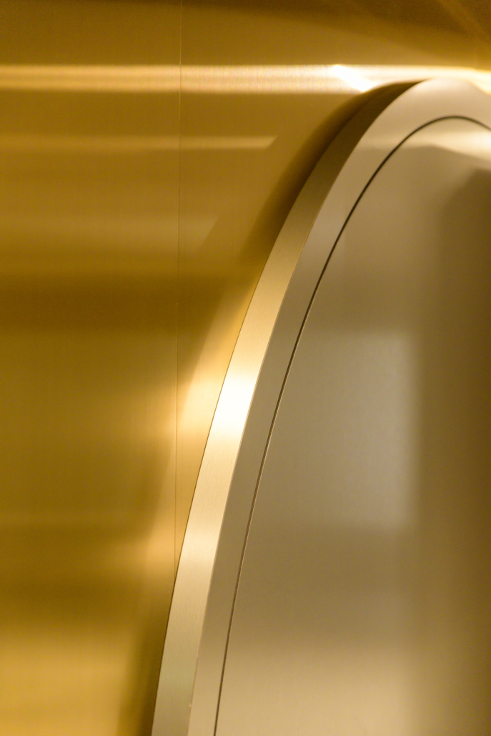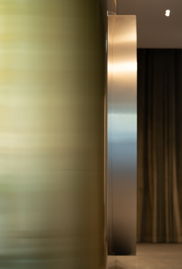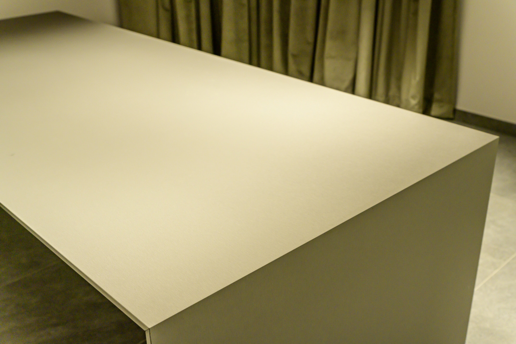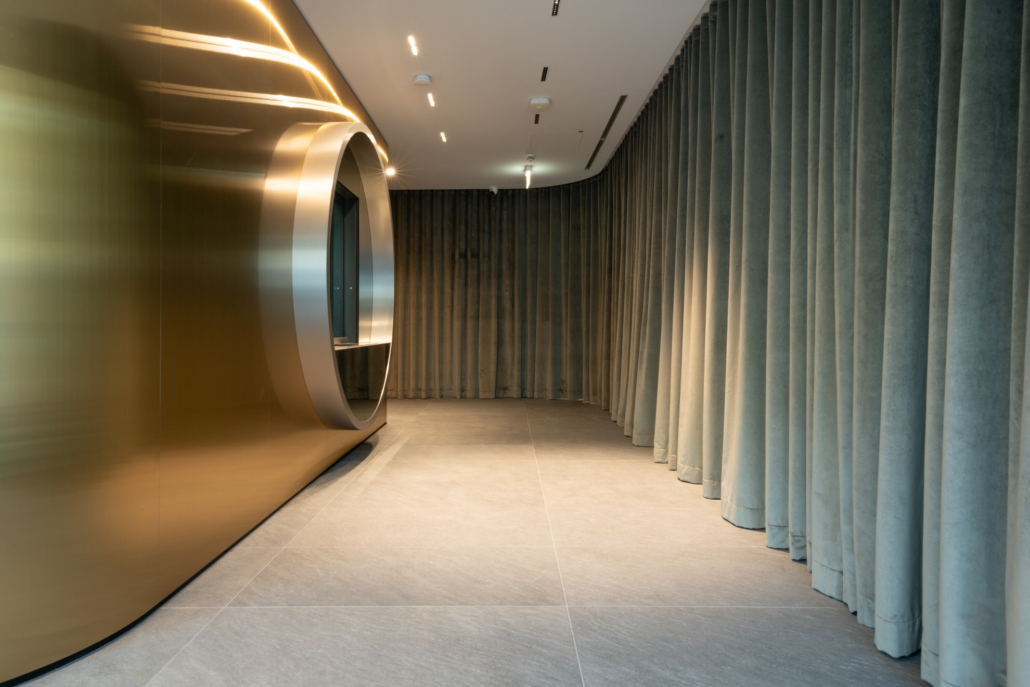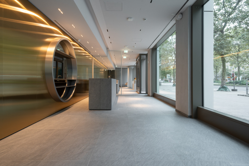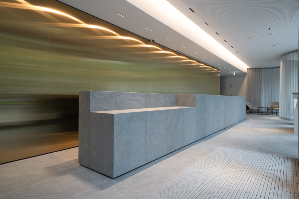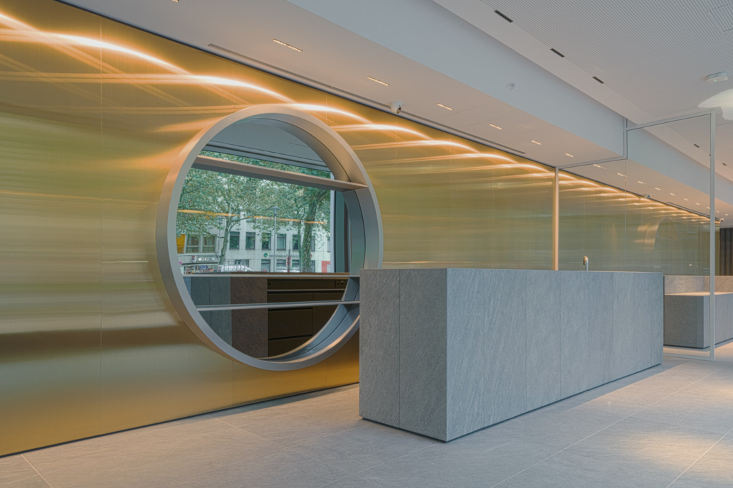 Zentraler Anlaufpunkt ist die maßgefertigte Empfangstheke, die Seriosität und Wertigkeit ausstrahlt und den ersten Eindruck nachhaltig definiert. Ergänzt wird das Raumkonzept durch großflächige Wandpaneele aus Edelstahl Rimex T22 Prestige Gold Hairline, die mit ihrer fein strukturierten Oberfläche für Tiefe, Eleganz und einen subtilen Glanz sorgen.