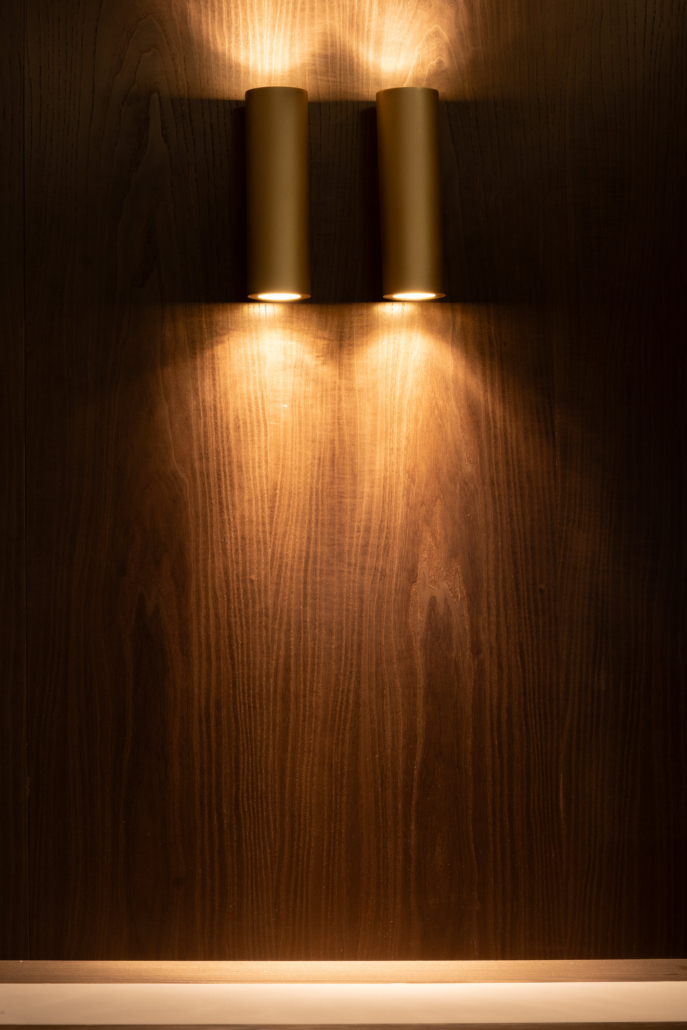 Besondere Akzente setzen die edlen Wand- und Ablageflächen mit TABU-Furnier, die dem Raum Wärme und Exklusivität verleihen. Gekrönt wird das Konzept durch eine indirekt beleuchtete Decke aus goldenem Mesh-Gitter, die dem Projekt eine außergewöhnliche Atmosphäre und eine klare gestalterische Identität gibt.